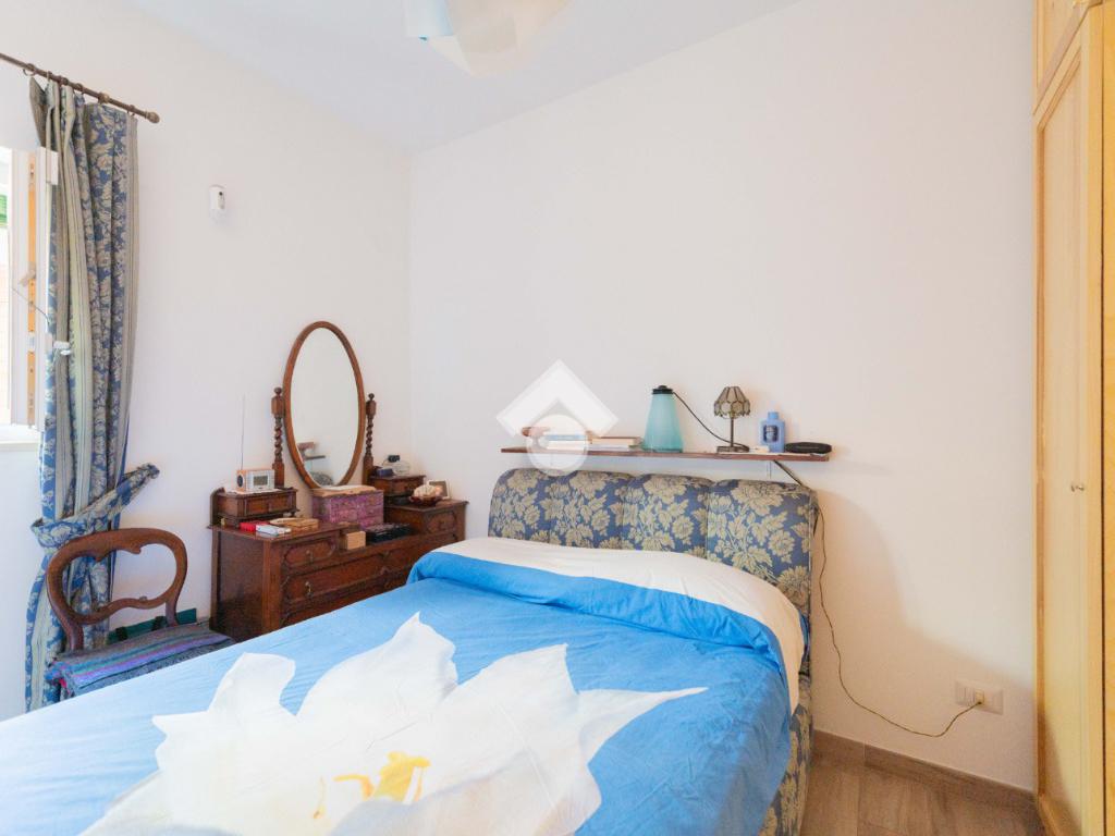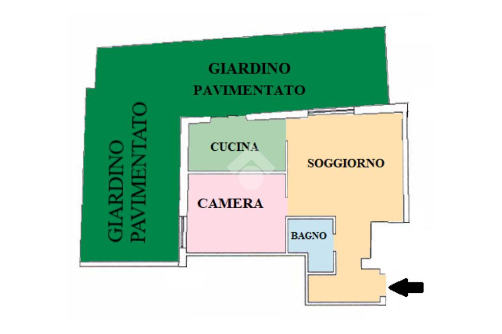 L'appartamento si compone di: ingresso, soggiorno, cucina, camera da letto con armadiatura a muro, bagno con box doccia e giardino pavimentato accessibile dalla zona giorno.